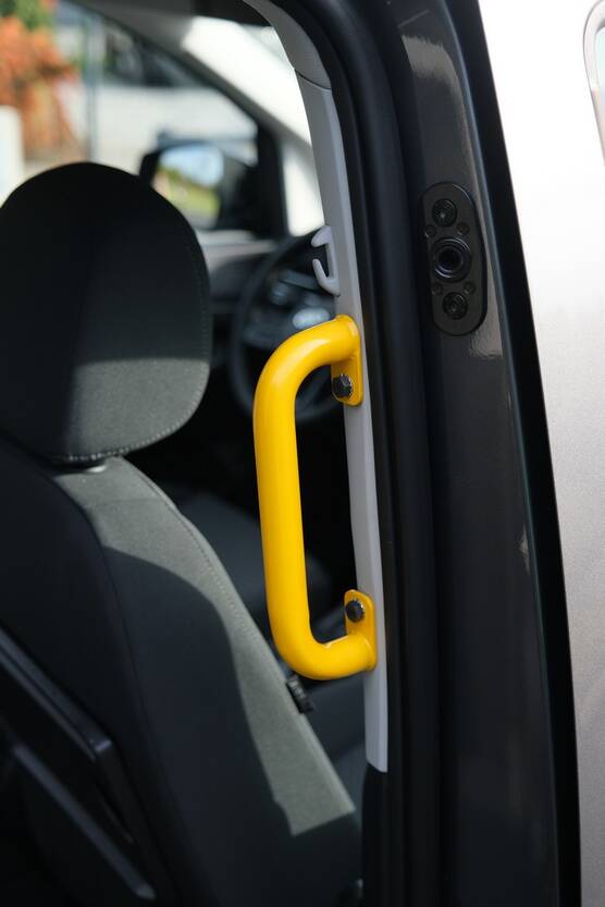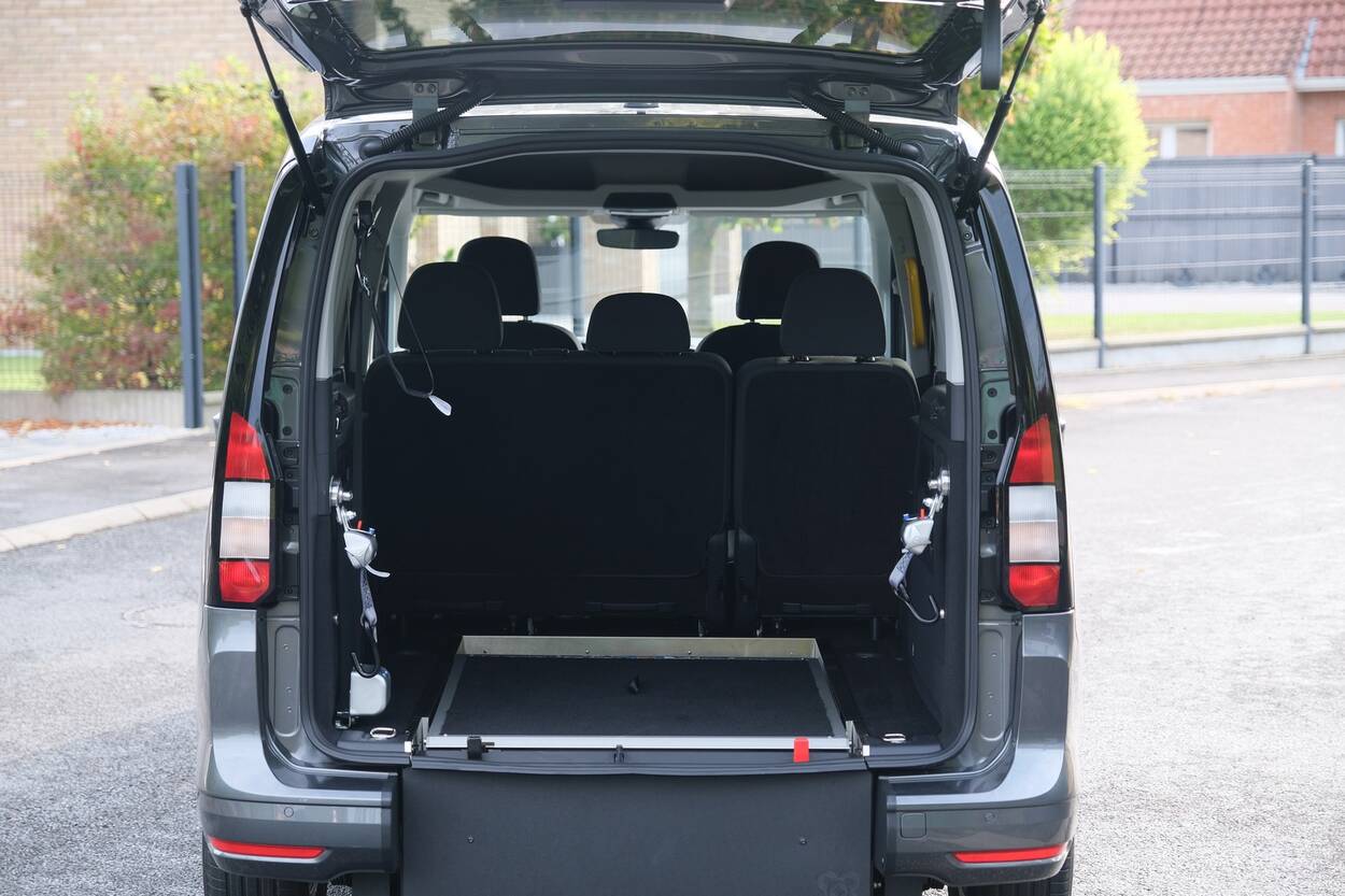 Véhicule pour un fauteuil roulant avec une rampe d'accès manuelle repliable en plancher plat dans le coffre (HappyAccess), un décaissement arrière, une banquette d'origine ⅔-⅓ rabattable, un système d'arrimage 4 sangles avec ceinture de sécurité épaulière 3 points et enrouleurs avant à blocage électrique, une poignée d'aide à la montée en passager avant, un support de rangement monté en paroi pour paire de sangles à enrouleur, un éclairage sur hayon de coffre pour faciliter la visibilité lors du transfert du fauteuil roulant, un système magnétique sur décaissement pour l'accroche des 2 crochets d'enrouleurs avant.