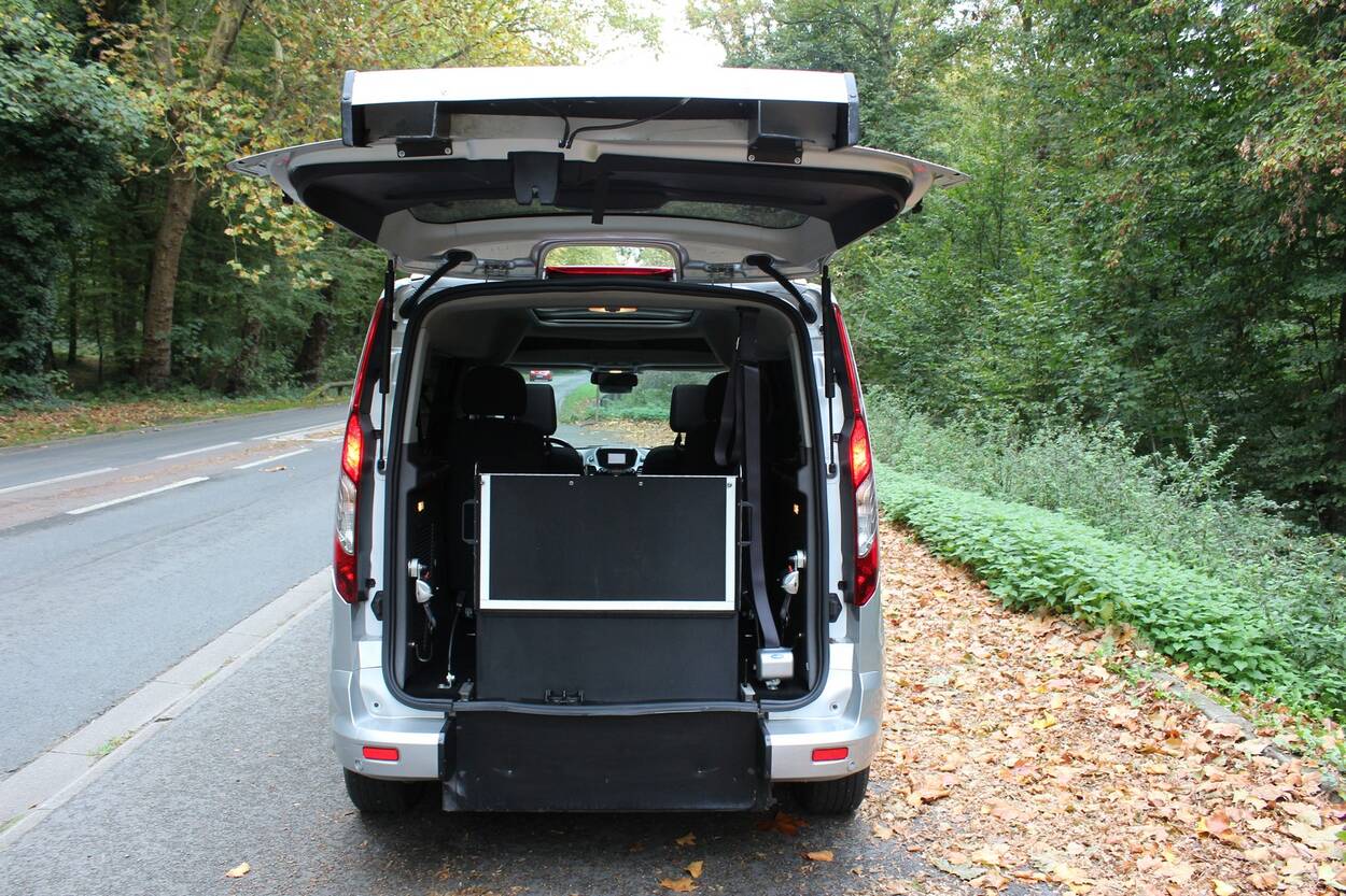Véhicule aménagé pour transporter une personne en fauteuil roulant avec une rampe d'accès manuelle en 2 volets, un décaissement arrière, 2 sièges individuels amovibles, un système d'arrimage 4 sangles avec ceinture de sécurité 3 points et enrouleurs avant à blocage électrique, supports pour crochets d'arrimage montés en paroi, un kit pro passager avant (marchepied amovible et poignée montoire).